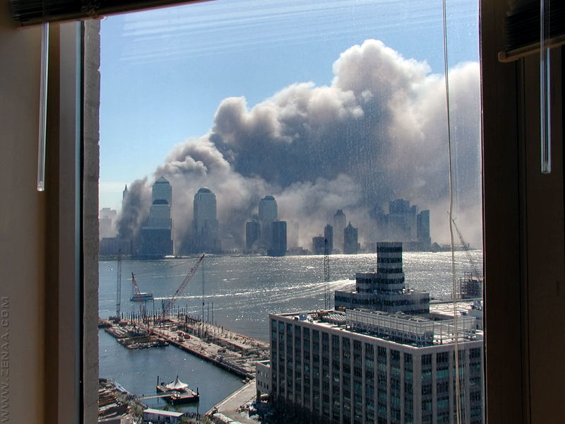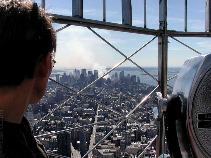 "I arrived in New York City on September 10th for a seven day city trip vacation. The next morning I left my hotel early, to visit the observation deck of the World Trade Center which opens at 9.30AM. So I would be sure to be the first one up on the observatory roof. Around 8.30AM I walked from Chambers Street subway station towards the WTC, impressed by the immense height of the two shiny towers. I never had been to Manhattan before. I walked through the shopping concourse underneath the twin towers, following the signs for the observation deck ticket office. My plan was to first check the location of the ticket office, then going to the WTC plaza to take photos of the towers, until the ticket office opens. While standing on an escalator in the lobby of the South Tower, suddenly there was a bang and I saw debris coming down. This was the first plane hitting the other tower. I ran down the escalator and out of the building through an exit on Liberty Street. Dust and office paper came down from the smoking holes in the North Tower. At the time of the second impact, I was in Vesey Street opposite the Millennium Hilton, and took cover behind a van. Then I decided to get away, thinking more planes might be on their way to crash onto Manhattan. On West Street I joined two New York businessmen on their way to the marina for a ferry to Jersey City. To get there, we had to take the risk of getting closer to the WTC. The South Tower collapsed a few minutes after we arrived at the Jersey City waterfront. Luckily we had managed to get away just in time! We spent the rest of the day in the apartment of one of the businessmen, overlooking lower Manhattan. Through the windows we saw the North Tower collapse. In the evening I returned to my hotel in Brooklyn by PATH-train and subway. I want to thank John and Carlos for helping me get away from the WTC site, and especially John for letting me stay in his apartment during the day." — Jeroen Morriën, The Netherlands (info2@zenaa.com)